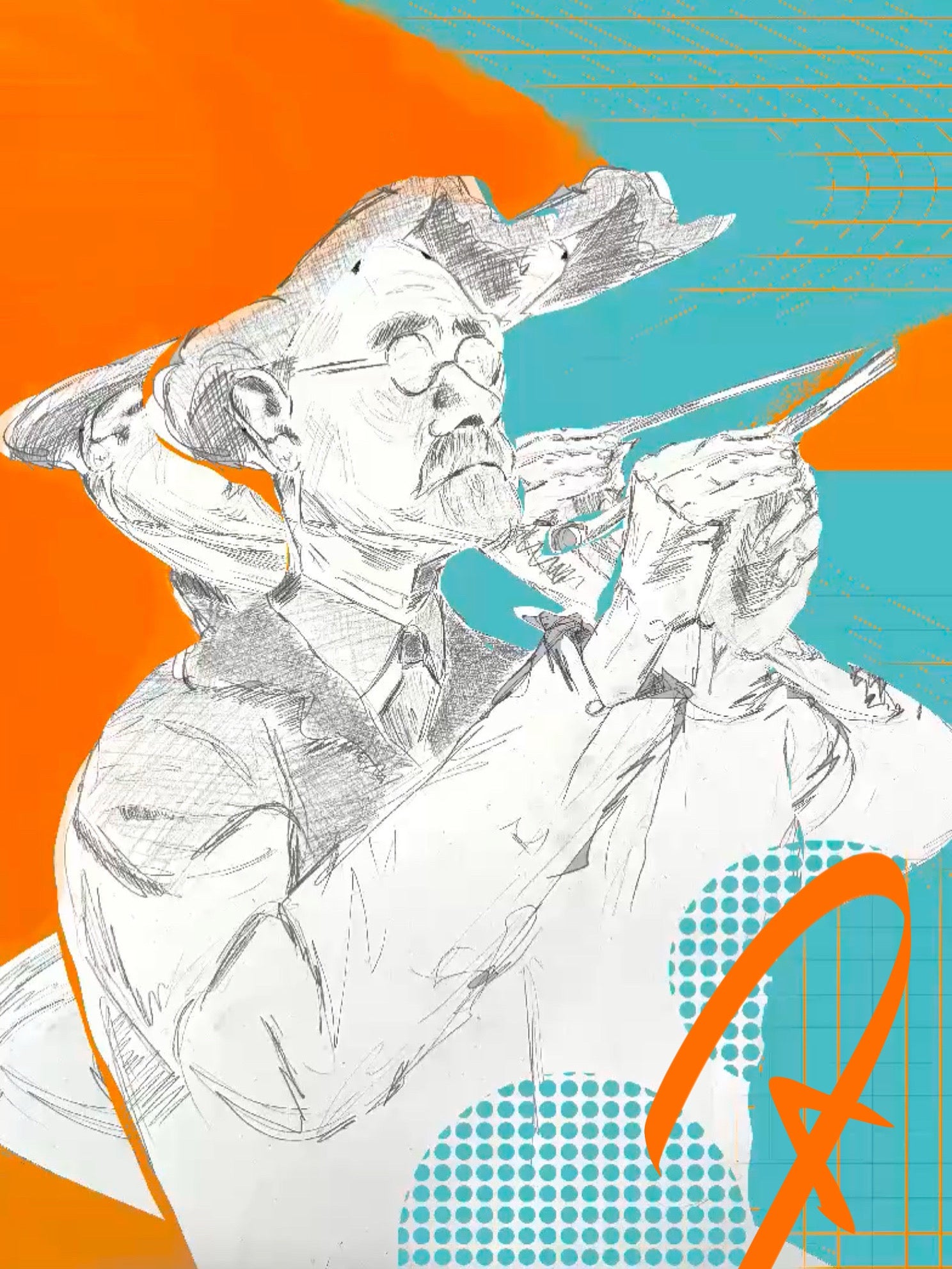 Dessin au graphite sur papier grain fin A3, modifié et enrichi de touches de couleur digitale
