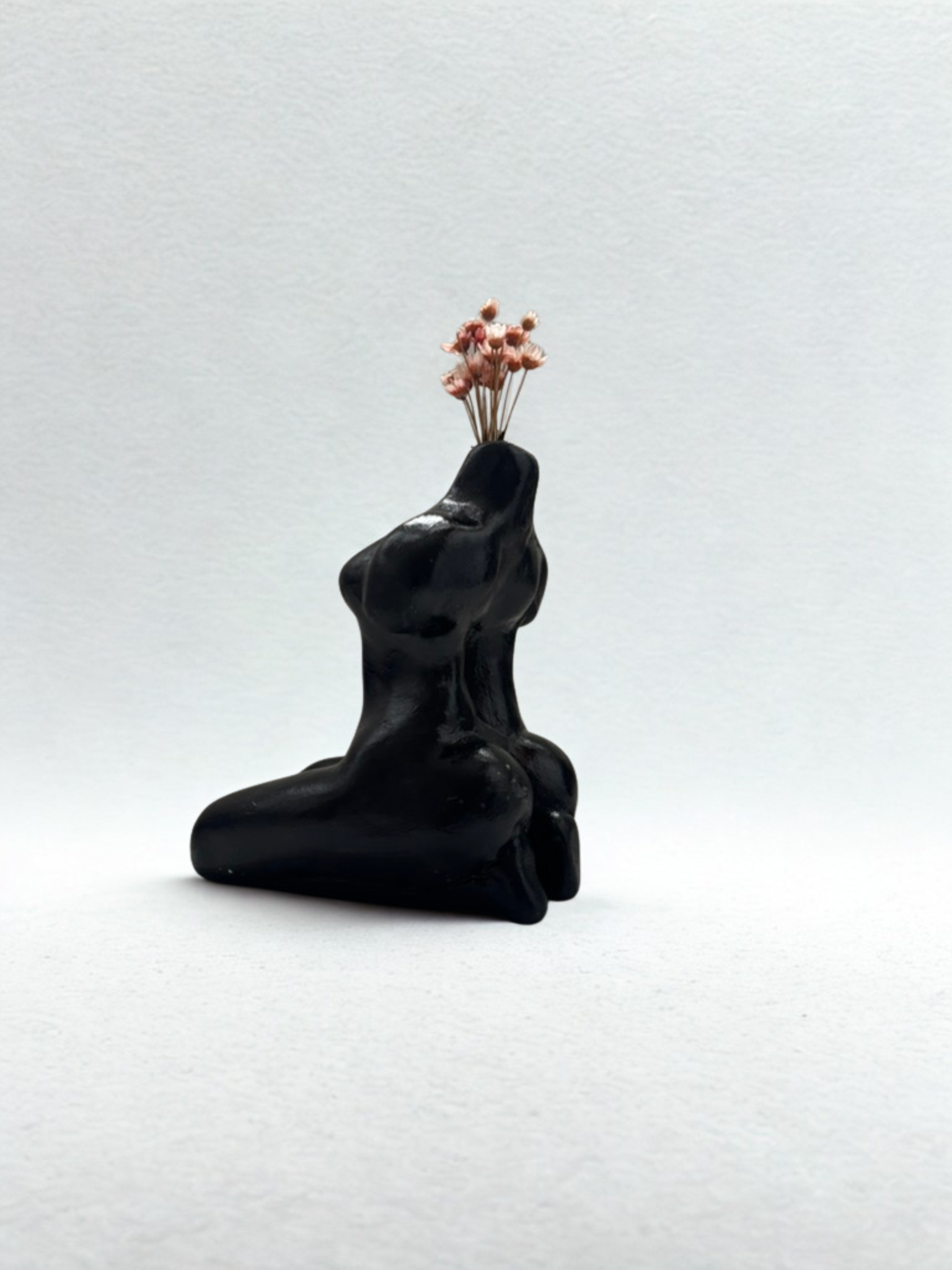 Sculpture en argile, peinte et vernie. Ajout de fleurs séchées